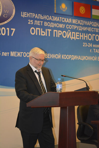 Сорокин А.Г., начальник отдела НИЦ МКВК ознакомил участников конференции с результатами комплексного исследования вопросов управления водными ресурсами трансграничных рек бассейна Амударьи на перспективу в условиях климатических и иных изменений в увязке с национальными планами развития орошаемого земледелия и гидроэнергетики, полученными в рамках проекта "Адаптация управления водными ресурсами трансграничных вод бассейна Амударьи к возможным изменениям климата" (программа PEER - «Партнерство для усиленного вовлечения в исследования», финансируемая ЮСАИД).