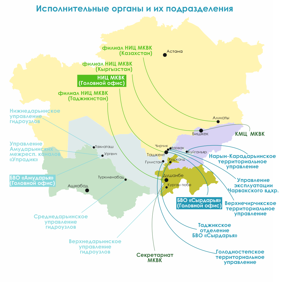 БВО «Сырдарья» — обеспечивает оперативное управление и распределение водных ресурсов бассейна между государствами, своевременную и бесперебойную подачу воды водопотребителям в пределах установленных лимитов (согласованных с государствами) и санитарно-экологических попусков в зону Приаралья и Аральское море.