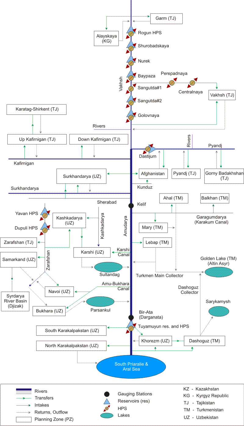 In Amu Darya basin there are two large river seasonal storage reservoirs: Nurek on Vakhsh River, Tuyamuyun in lower reaches and dozen of in-basin and in-system reservoirs.