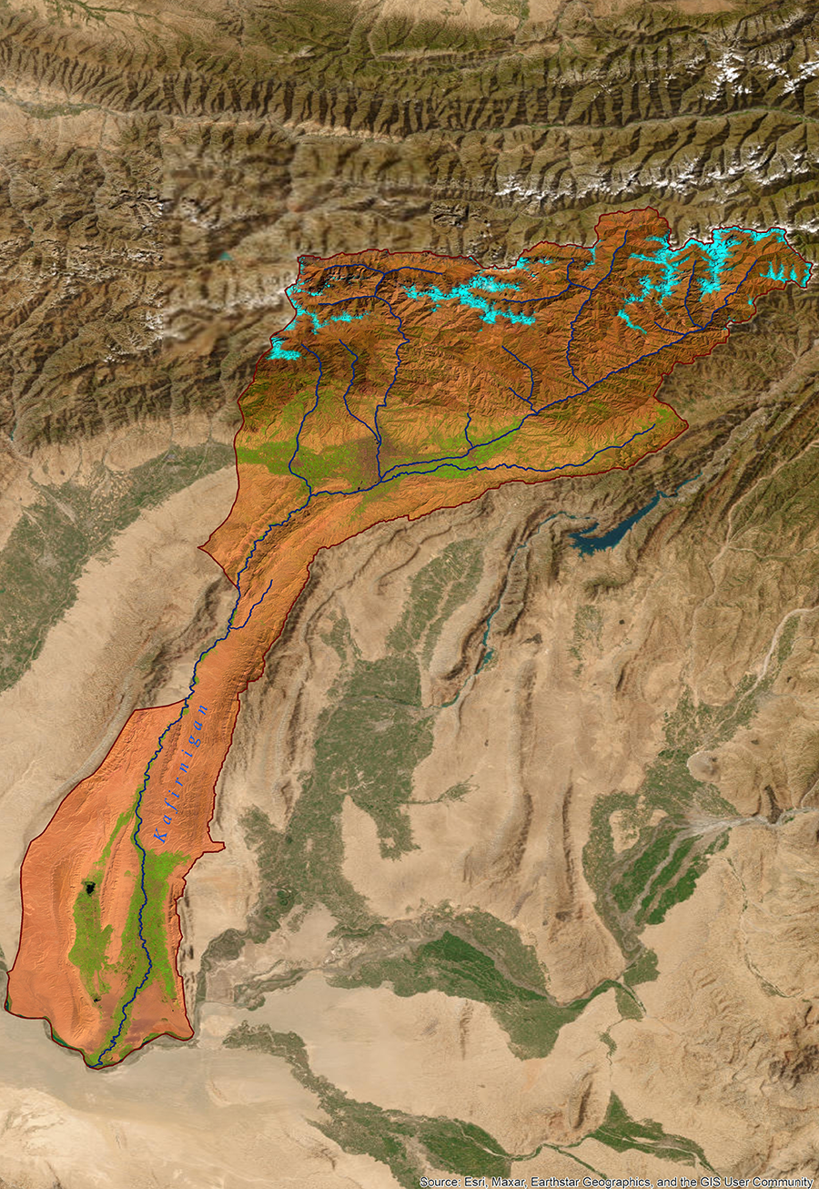 Amu Darya River basin covers totally territory of Turkmenistan and part of Tajikistan and Uzbekistan, Kyrgyzstan and Afghanistan.