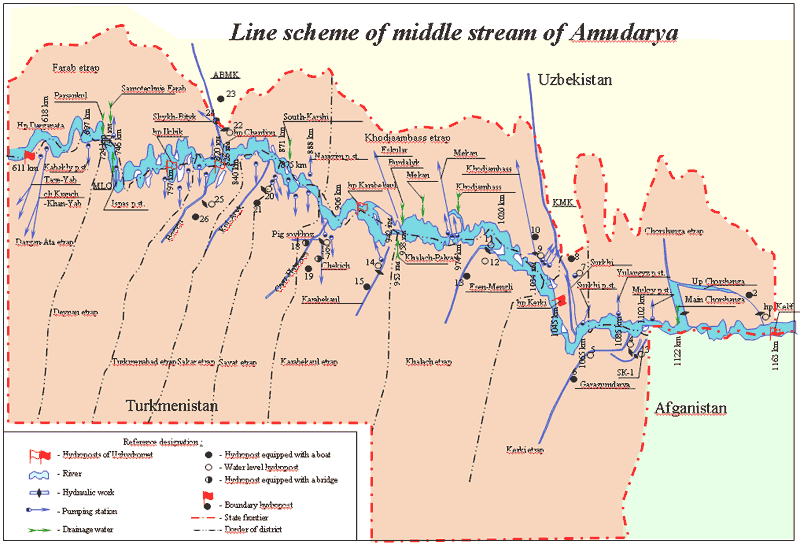 Middle Darya Division controls water intakes at the Amu Darya River 552 km reach from the Kelif to Darganata hydroposts (Middle reaches).