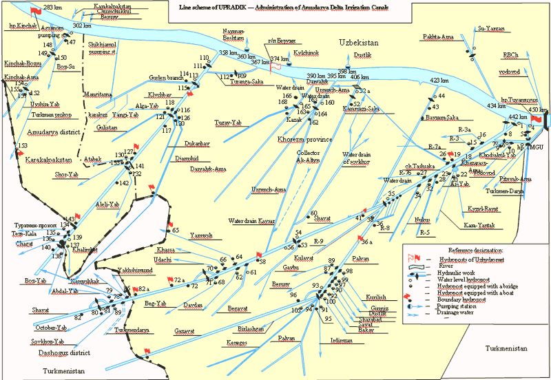 Amu Darya Inter-republican Canals Division (Upradik) operates 11 river intake structures and 52 hydrostructures on main canals, 337 km of main canals, controls water intakes within river 167 km reach from the Tuyamuyun hydroscheme to the Kipchak hydropost (Lower reaches). Upradik manages three large-scale irrigation systems: Tashsaka, Klychniyazbai and Kipchak-Bozsu