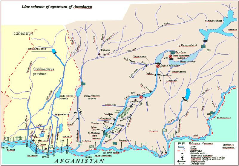 Upper Darya Division perates intake structures, controls water intakes from the Vakhsh, Panj, and Kafirnigan rivers and on the Amu Darya River 246 km reach up to the Kelif hydropost (Upper reaches).