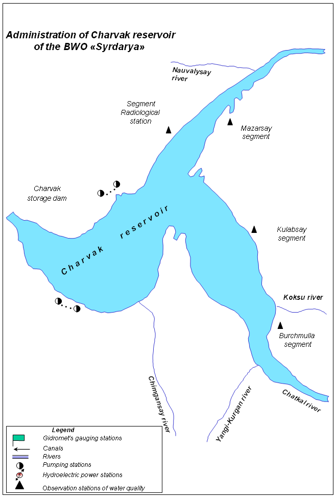 The Charvak reservoir administration includes 4 reference stations and is responsible for control of water quality, protection of water resources and the reservoir area with adjacent water-protection zone from pollution, and maintenance of good sanitary conditions.