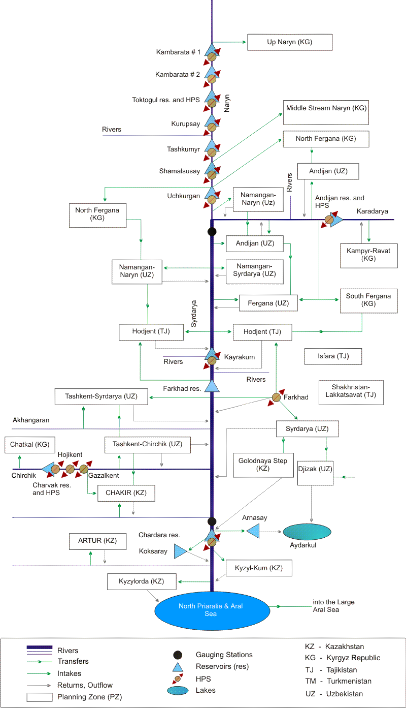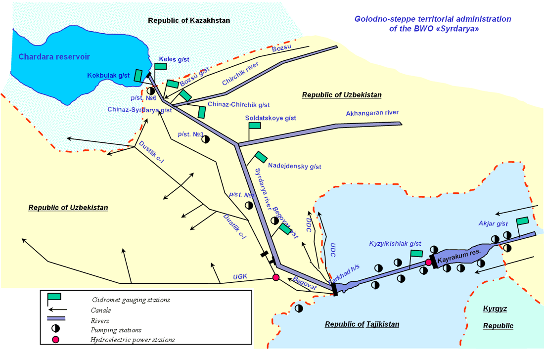 Downstream of the Shardara reservoir, similar work is undertaken by the BWO “Aral – Syr Darya” at the Committee of Water Resources of the Kazakh Ministry of Water Resources and Irrigation.