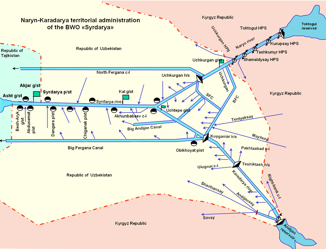 BWO Syr Darya is responsible for transboundary water management and interstate water allocation from the Toktogul reservoir to the border of the Republic of Kazakhstan (the Shardara reservoir).
