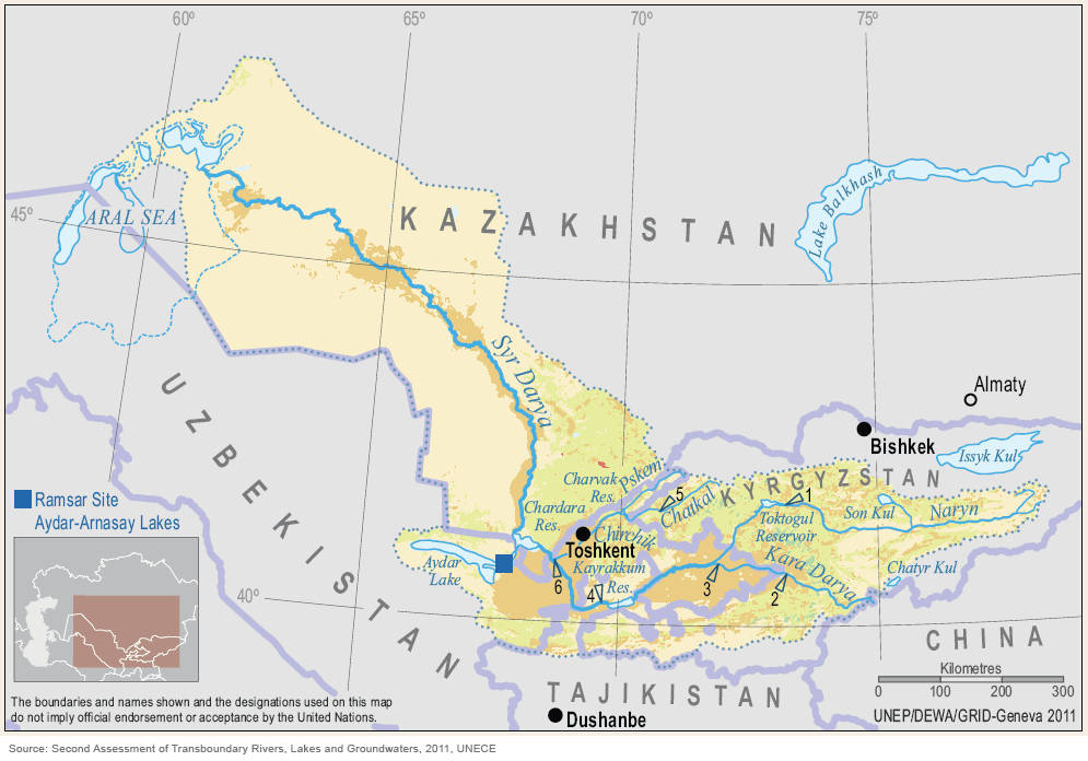 Syr Darya river basin comprises the following Central Asian sovereign states: the Republic of Kazakhstan, the Kyrgyz Republic, the Republic of Tajikistan and the Republic of Uzbekistan. The length of Syr Darya from the confluence of Naryn and Karadarya rivers to the Aral Sea is 2337 km, and with Naryn river — 2790 km, basin area is 150 100 km2.