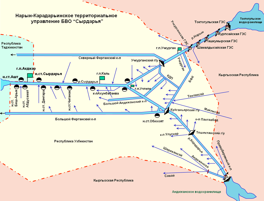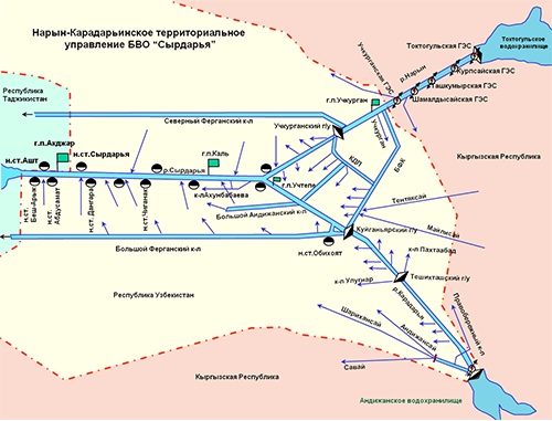 Нарын-Карадарьинское управление имеет 4 эксплуатационных отделения и охватывает водохозяйственный комплекс бассейна реки Нарын от Учкурганской ГЭС до слияния с рекой Сырдарья, бассейна реки Карадарья от Андижанского водохранилища до слияния с рекой Сырдарья и бассейна реки Сырдарья от слияния рек Нарын и Карадарья до гидропоста Акджар.