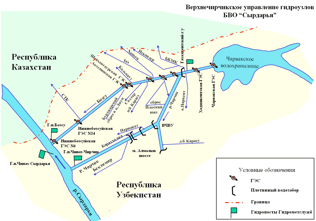 Верхнечирчикское управление имеет 3 гидроучастка, выполняет водораспределение между Узбекистаном и Казахстаном и контролирует участок бассейна реки Чирчик от Чарвакского водохранилища до слияния с рекой Сырдарья и деривационный канал Бозсу.